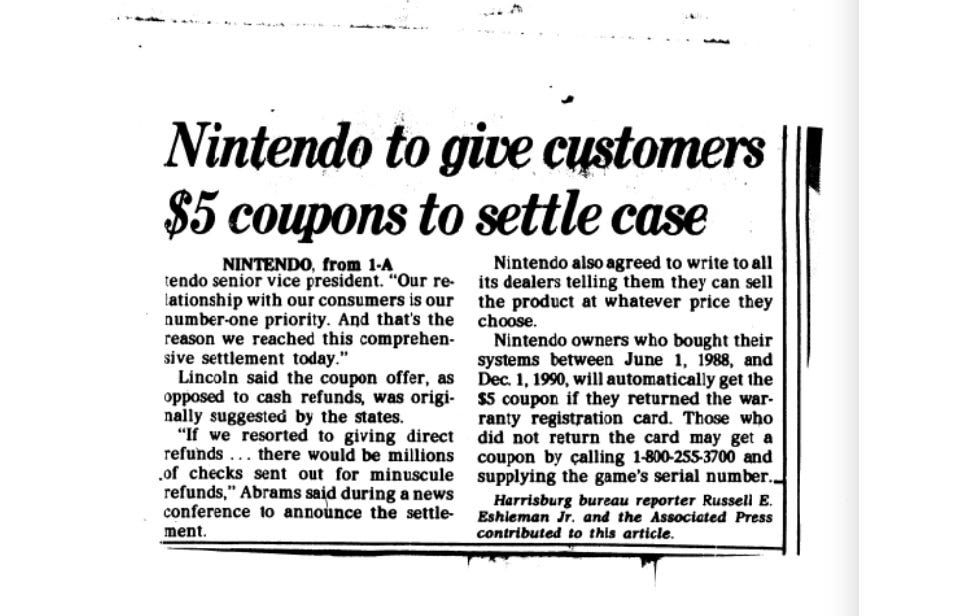 In 1991, the video game company gave out millions of dollars worth of $5 coupons to settle allegations of price fixing